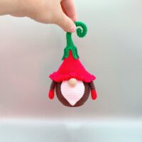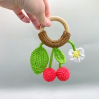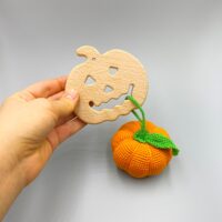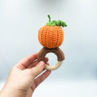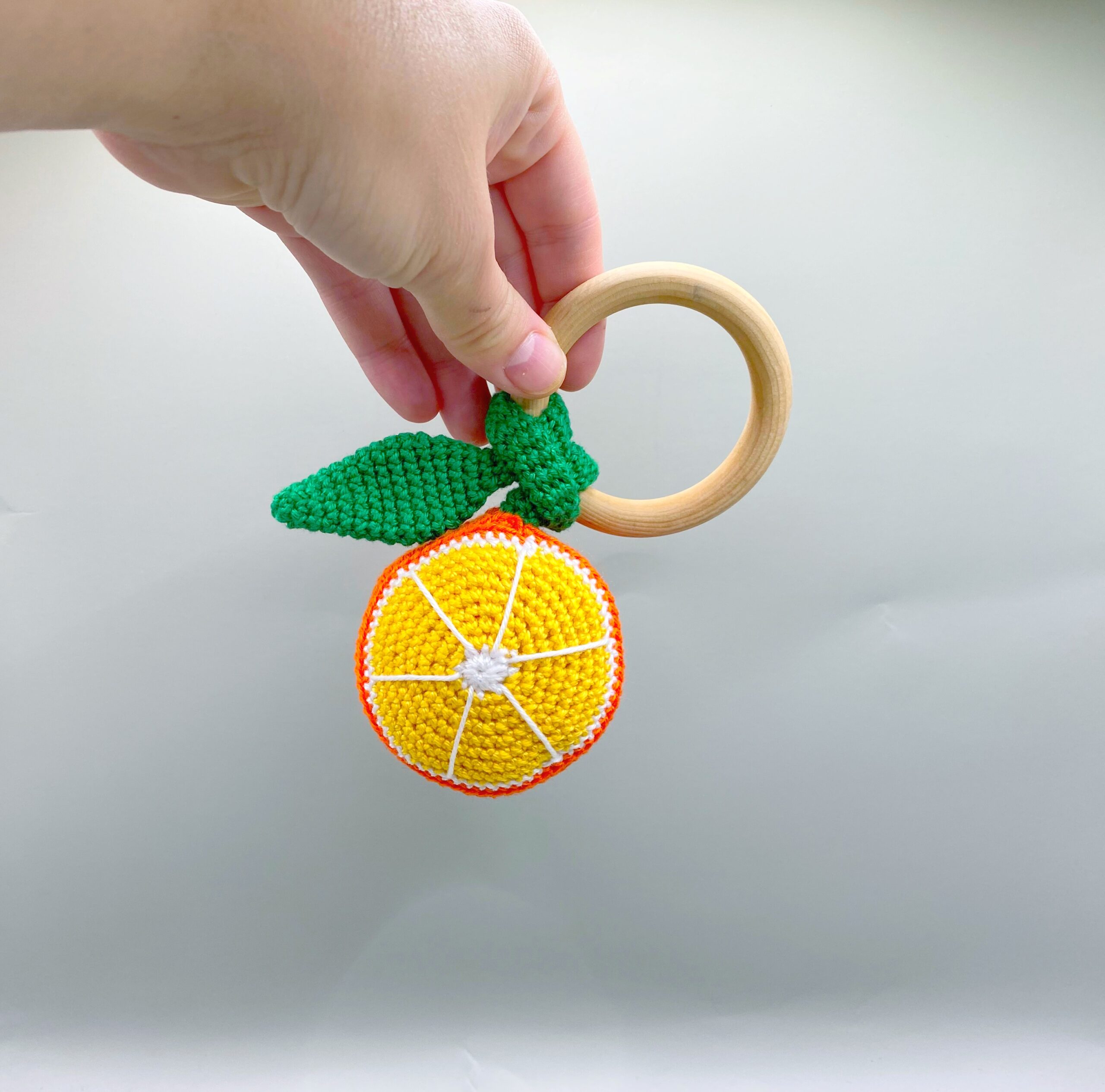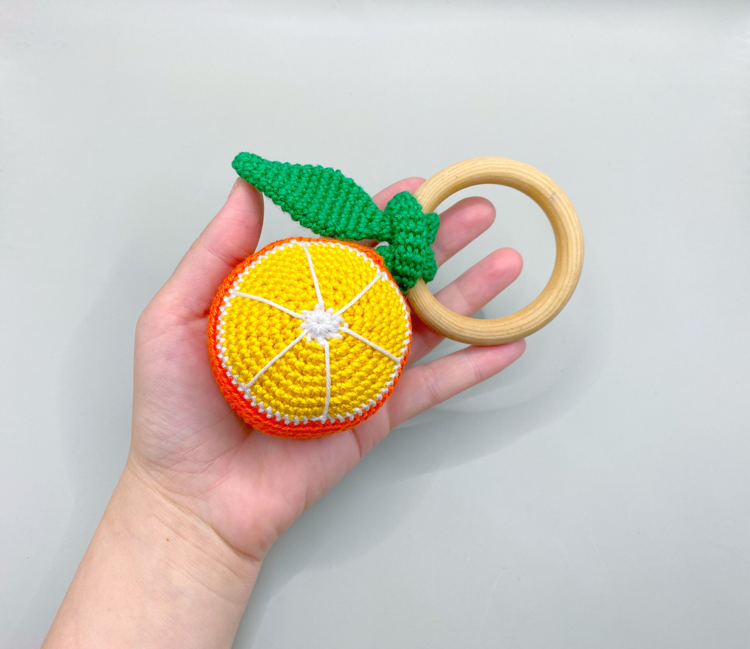 Materials: 100% cotton yarn, fiberfill, a wooden ring (beech wood), rattle inside orange.