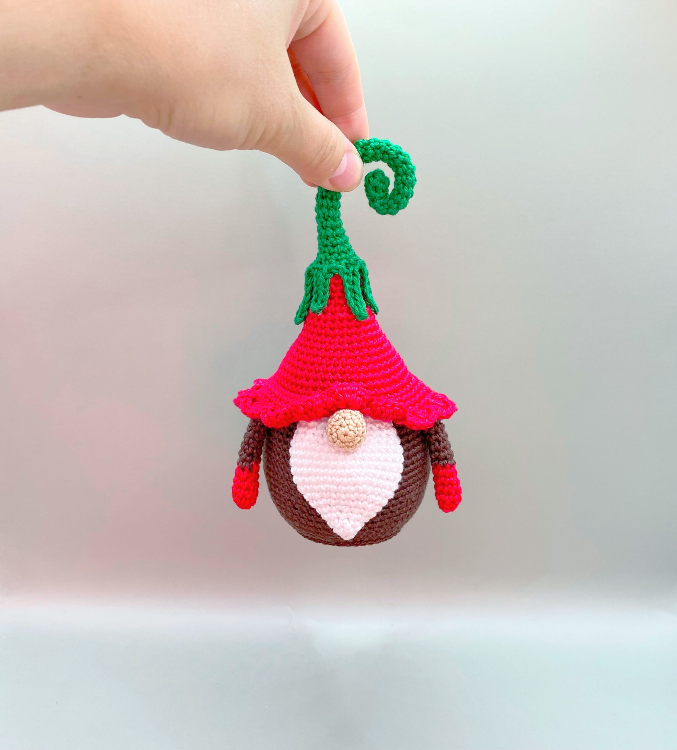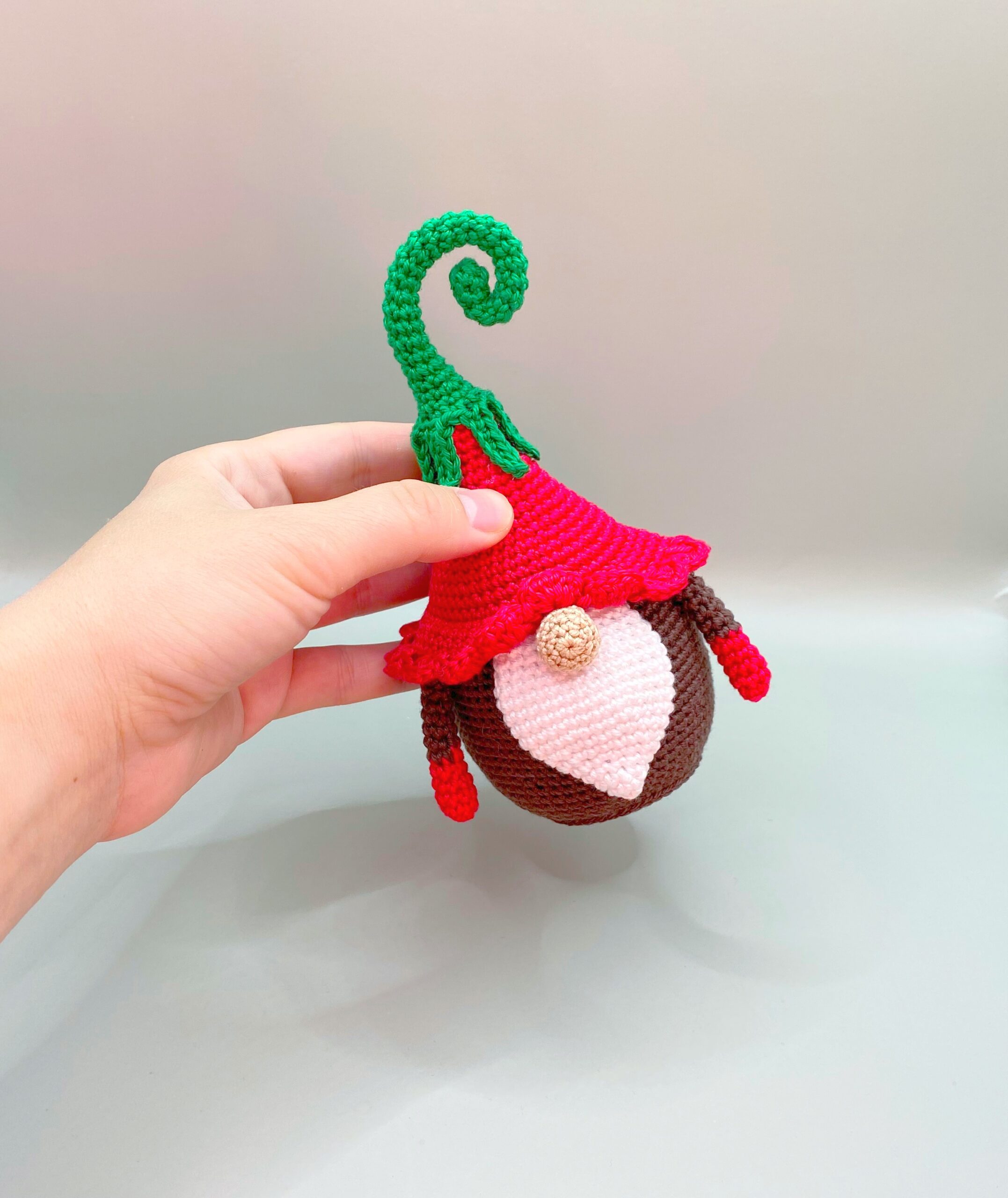 This gnome is crocheted of cotton yarn and filled with hypoallergenic hollofayber.